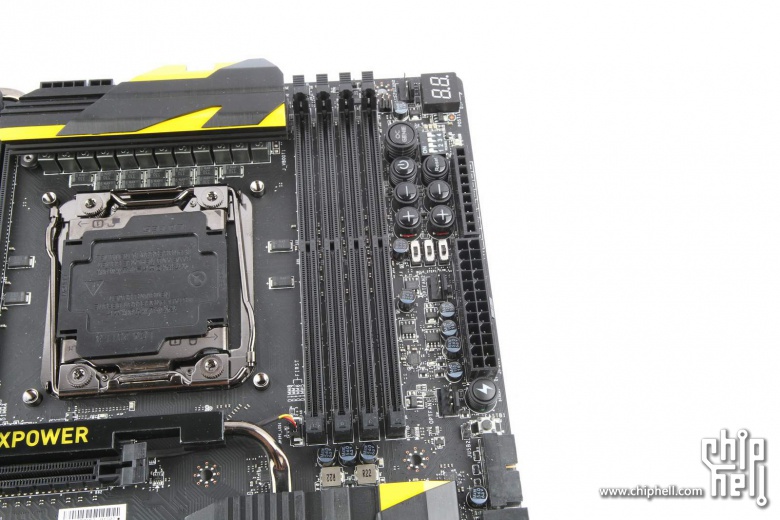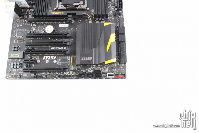 La MSI X99S XPOWER AC presenta 12 fasi PWM digitali per la gestione dell'alimentazione del processore, con un heasink dotato di una heapipe. Una soluzione simile è presente anche per la zona del chipset Intel X99. Molto curata appare la zona dei controlli onboard con l'immancabile presenza di un debug LED, proprio in prossimità dei quattro slot di memoria DDR4. Per l'espansione sono presenti cinque slot PCI-E 3.0 x16, un PCI-E x1 (aperto) un connettore SATA Express e otto SATA 6 Gbps.