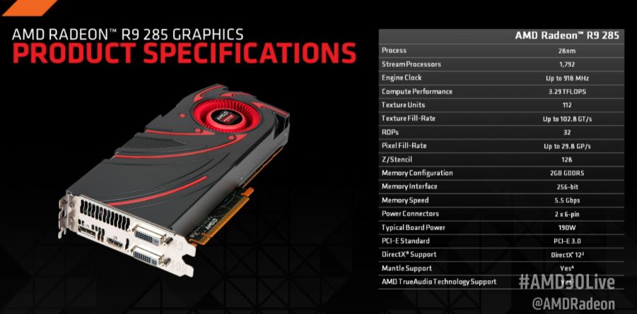 La GPU AMD Tonga ha architettura a 28 nm, 1792 stream processors, 112 TMUs, 32 ROPs, frequenza di 918 MHz, memoria da 2 GB e 4 GB GDDR5 con frequenza di 5,5 GHz con interfaccia da 256-bit. L'alimentazione supplementare è fornita da due connettori da 6-pin e il TDP dichiarato è di 190 W. Il prezzo, secondo le slide, sarà di 250 Dollari. Si parla anche di una versione R9 285X, ma al momento le informazioni sono pressoché nulle ed è consigliabile attendere la presentazione da parte di AMD per avere tutte le certezze del caso.