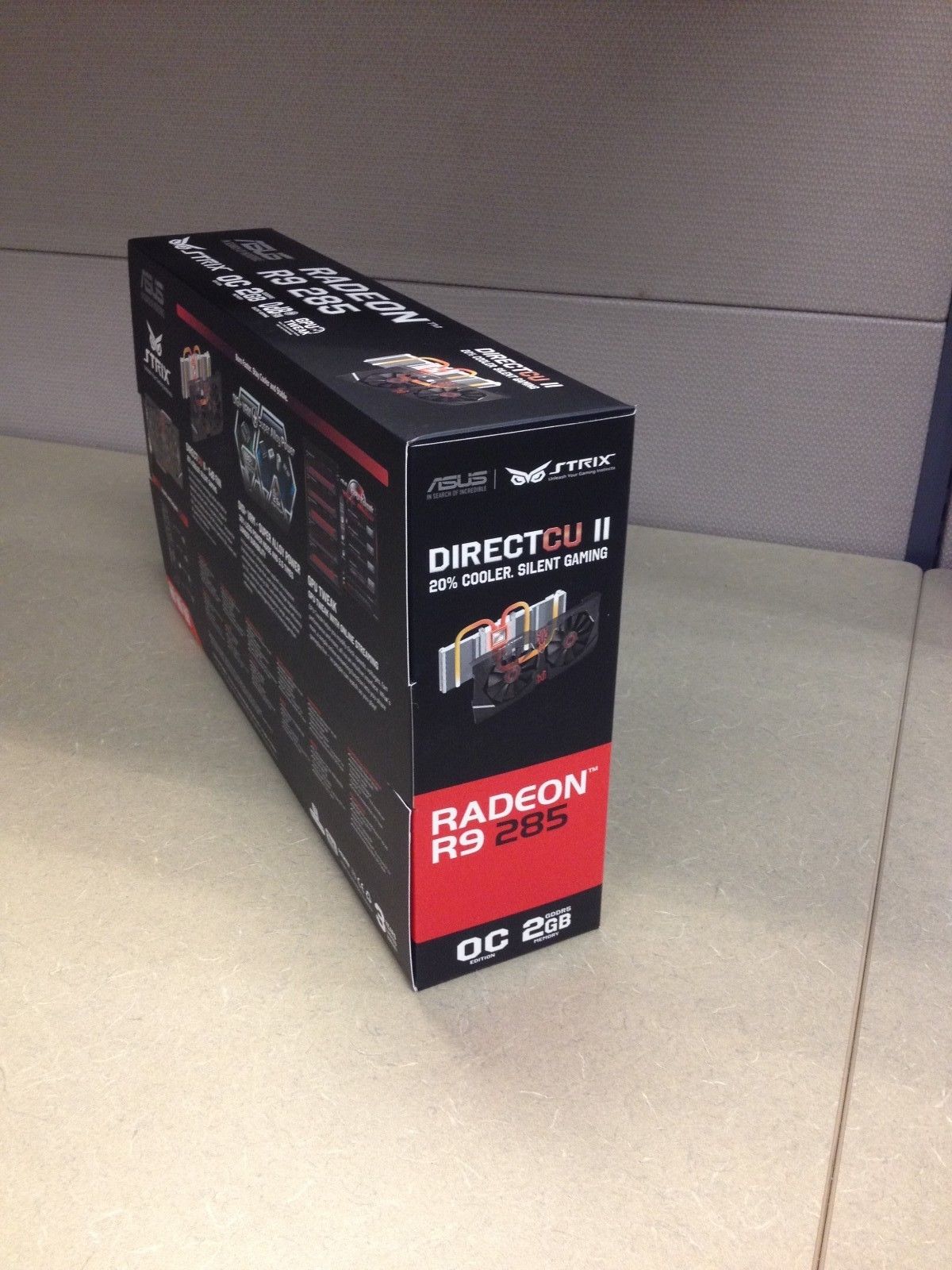 La versione ASUS Radeon R9 285 Strix, qui in versione OC Edition, appare identica ai modelli conosciuti con il dissipatore DirectCU II e dalla scatola si ricava l'informazione caratteristica della serie, ovvero la funzione 0 dB che disattiva le ventole quando la temperatura è bassa.