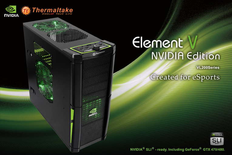 Thermaltake, marchio leader nel mondo per la produzione di case ad alte prestazioni, alimentatori ad alta efficienza ed innovative periferiche per il DIY (Do It Yourself), è lieta di annunciare il primo case full-tower al mondo certificato NVIDIA, per le schede grafica di prossima generazione ed ultra performanti. Thermaltake Element V NVIDIA Edition supporta le ultime schede grafiche NVIDIA GeForce GTX 480 e GTX 470 GPUs ed il sistema aggiuntivo per eATX “form factor motherboards” rende possibile espansioni ed aggiornamenti.