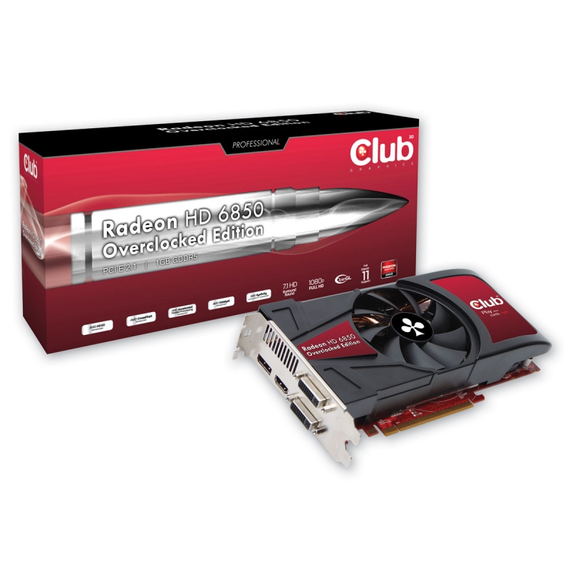 E' comparsa sul sito ufficiale Club 3D la scheda HD6850 Overclocked Edition CGAX-68524O, presenta frequenze operative di 820MHz per il core e 4400MHz per le memorie, contro i 775/4000 reference, 960sp, bus a 256 e ovviamente tutte le features caratteristiche della serie HD6800, come l'AMD HD3D technology e l' AMD Eyefinity aggiornato. Per il cooler system Club 3D ha impiegato un dissipatore custom a 2slot, munito di 2 Heatpipes (cosi pare dalla foto) e una ventola piuttosto ampia, posizionata centralmente.Quattro infine le uscite video, 2 DVI, 1 HDMI e 1 DisplayPort.