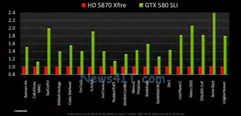 Dall'analisi dei grafici la GTX580 risulterebbe circa del 15-20% più veloce rispetto all'attuale top nvidia (GeForce GTX480); rapportando i grafici alla ATI 5870 , la prima risulterebbe in media il 35% più veloce di quest'ultima, mentre rispetto all'ultima proposta rilasciata da AMD, ovvero la 6870, il margine di vantaggio per nVidia incrementerebbe sino al 40-45% (in entrambi i casi di confronto con le schede video AMD, il margine incrementa grazie anche alla presenza di bench che evidenziano le capacità di tessellation delle schede nVidia).