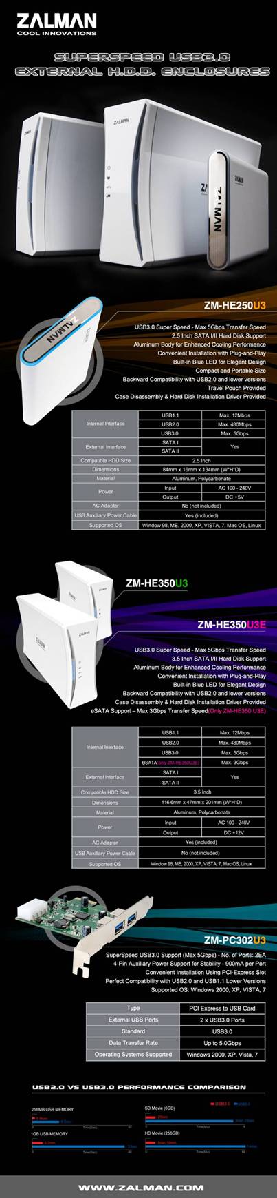 La Zalman, produttore Coreano specializzato nella produzione di sistemi di raffreddamento ad aria silenziosi, è lieta presentarvi la nuova serie Superspeed USB3.0 External H.D.D enclosure.Con i nuovi ZM-HE250 U3 e ZM-HE350 U3E sarà possibile trasferire anche i files più grandi sfruttando l’ultra velocità di 5Gbps.
