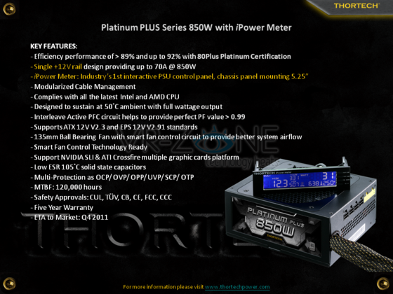 Il Thortech Platinum Plus Series da 850W riesce infatti ad ottenere un'efficienza superiore al 92% e un PFC superiore allp 0.99 al 50% di carico. L'alimentatore è pensato per sistemi Multi-GPU SLI e Crosffire ed è stato progettato con una singola linea +12V in grado di erogare ben 70A.