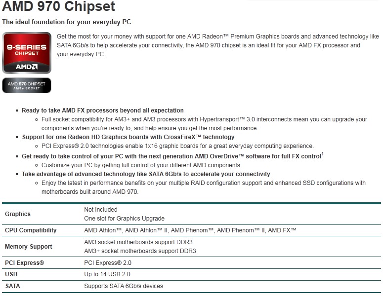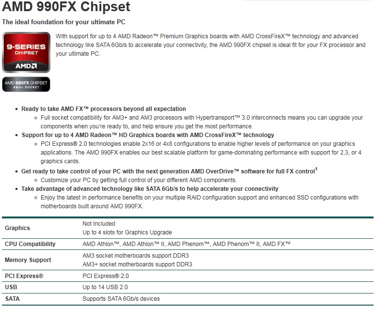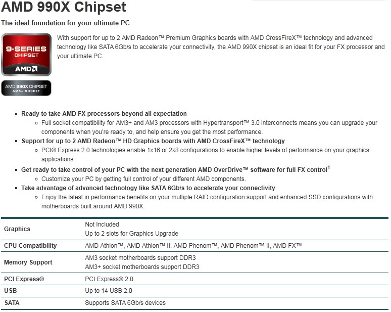 Le principali differenze tra i tre chipset riguarda il numero di link PCI Express per l'installazione di schede video nel sistema. Il 990FX equipaggerà le schede top di gamma AM3+ e permetterà di gestire fino a 4 schede video (SLI o Crossfire) con link Pci Express 2.0 @ x8 o due schede video @ x16. Il 990X potrà gestire 2 schede @ x8 o una @ x16 e il 970 permetterà soltanto configurazioni a singola scheda video @ x16.