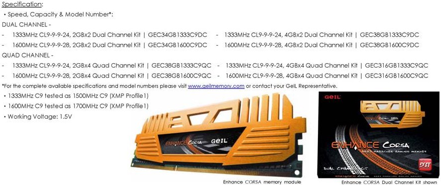 Geil noto produttore di memorie ha oggi presentato due nuovi kit di memorie DDR3 per sistemi Intel Sandy Bridge. I due nuovi kit sono Evo Corsa e Enhance Corsa e sono disponibili in configurazione Dual Channel e Quad Channel.Le nuove Geil Enhance Corsa hanno frequenze operative fuori dal comune difatti operano a 1500 MHz CL9 e 1700 MHz CL9 anzichè con la frequenza standard di 1333 MHz e 1600 MHz. I moduli sono raffreddati da degli heatsink con tecnologia MTCD che sta per Maximum Thermal Conduction & Dissipation Technology ed hanno una colorazione arancione come possiamo vedere dall'immagine seguente.