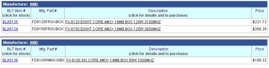 Sul sito Shopbit.com appaiono in pre-ordine tre processori AMD della serie FX, basati sul socket AMD AM3+.Le CPU Bulldozer interessate sono: la FX-8120, la FX-8150 e la FX-6100. I processori serie 8000 sono costituiti da 8 core (8 threads), mentre il FX-6100 dispone di 6 core (6 threads).Il più prestante, FX-8150, opera ad una frequenza di 3,6 GHz che grazie alla tecnologia Turbo può raggiungere la frequenza di 4,2 GHz, dispone di 8MB di cache L2 e L3, TDP di 125W e costa 266,28 Dollari.