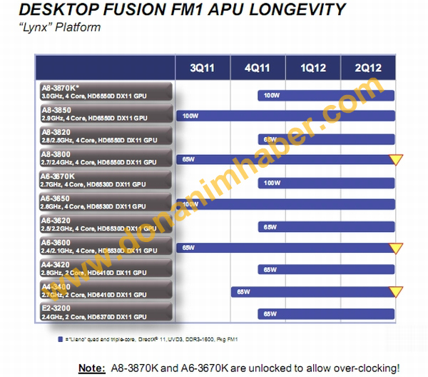 Nel frattempo, in un'altra slide si preannuncia l'uscita di nuovi modelli di CPU Llano, in particolare l'A8-3870K e il A6-3670K, che vengono definiti come modelli per l'overclocking, quindi con moltiplicatore sblocatto, usando una nomenclatura del tutto simile a quella utilizzata da Intel. Compaiono anche diversi altri dotati di tecnologia Turbocore, nonché dei dual core per ampliare la fascia bassa delle APU.