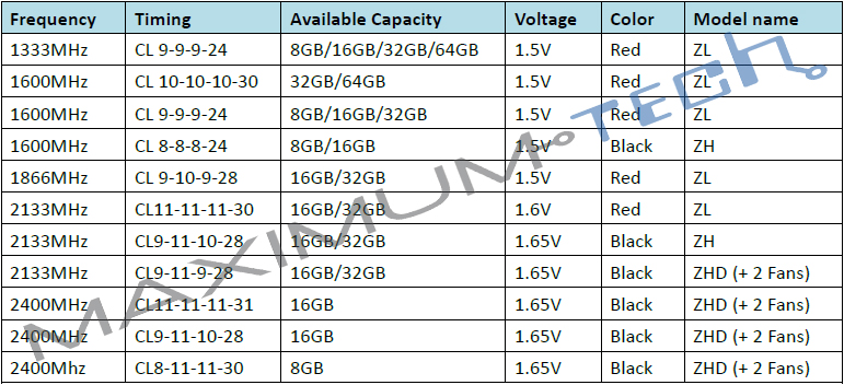 Le capacità variano da 8GB (4x2GB) a 64GB (probabilmente 8xGB), mentre le tensioni operative sono di 1.5V fino a 1866 MHz per poi raggiungere 1.65V alle frequenze più alte (2133 e 2400 MHz).