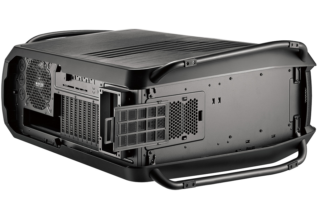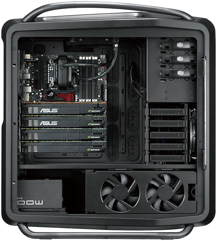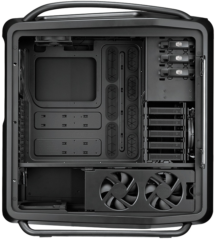 Internamente il Cosmos 2 è semplicemente immenso, con spazio fino a 10 ventole, 13 HDD, configurazioni 4-way SLI e Crossfire con schede video lunghe fino a 385mm. Ben 10+1 (per estensioni aggiuntive) gli slot PCI disponibili.