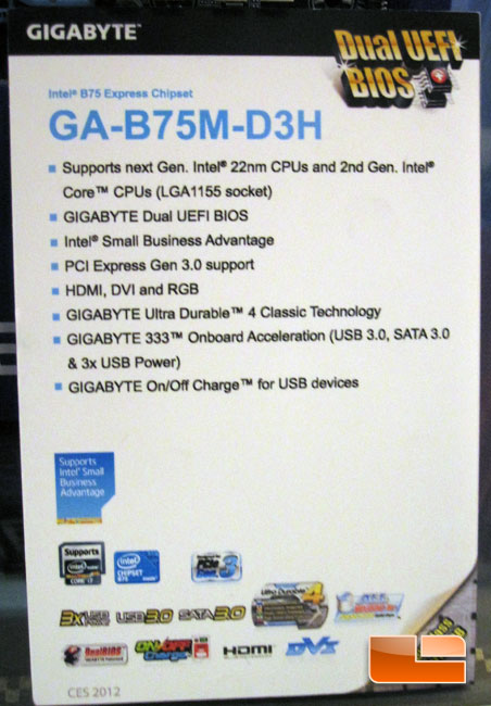 A concludere questa prima presentazione, troviamo la GIGABYTE GA-B75M-D3H, basata sul chipset Intel B75 invece che Z77, come visto nei precedenti modelli. Tale chipset, oltre ad alcune features, quali ad esempio le porte USB e SATA, perde la possibilità di overclockare il processore. Con un layout più spartano, vediamo le informazioni disponibili su questo modello micro-ATX.
