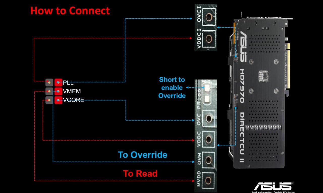 Le frequenze operative sono leggermente superiori al modello reference: 1000 MHz La ASUS HD 7970 DirectCU II è dotata di una features chiamata VGA Hotwire. Tramite un connettore a 2-pin, dove un'estremità viene saldata alla scheda video e l'altra a determinati connettori presenti nelle schede madri della famiglia ASUS ROG Rampage IV, si avrà completo accesso, per via software, al controller delle tensioni della mainboard per agire sulla scheda video senza l'utilizzo di resistenze variabili.er la GPU e 5.60 GHz / 1400 MHz per la memoria DDR5, contro i 925 MHz e 5.50 GHz / 1375 MHz definiti da AMD.