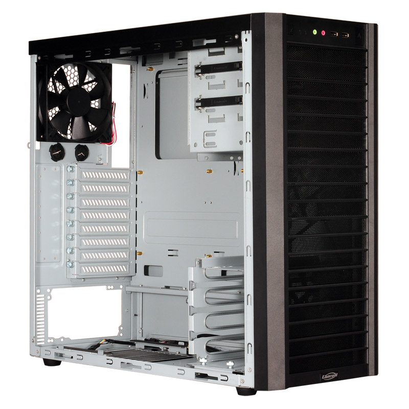 Il Lancool PC-K56N misura 210mm (W) x 472mm (H) x 505mm (D) e pesa 8,7 kg, supporta tre bay da 5,25" (con sistema di montaggio tool-less), tre alloggi per HDD da 3,5" e due per unità da 2,5"; quest'ultimi vengono fissati al Rrak con viti e sospensori in gomma per un effetto antivibrazione.