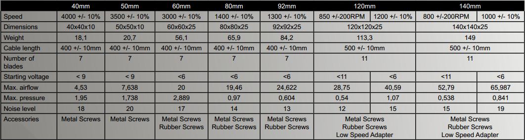 La serie è composta da ventole dal diametro di 40 mm, 50 mm, 60 mm, 80 mm, 92 mm, 120 mm e 140 mm. Tutti i modelli sono equipaggiati con cuscinetti idraulici ad alte prestazioni, che ne aumentano sia le performance che l'affidabilità.