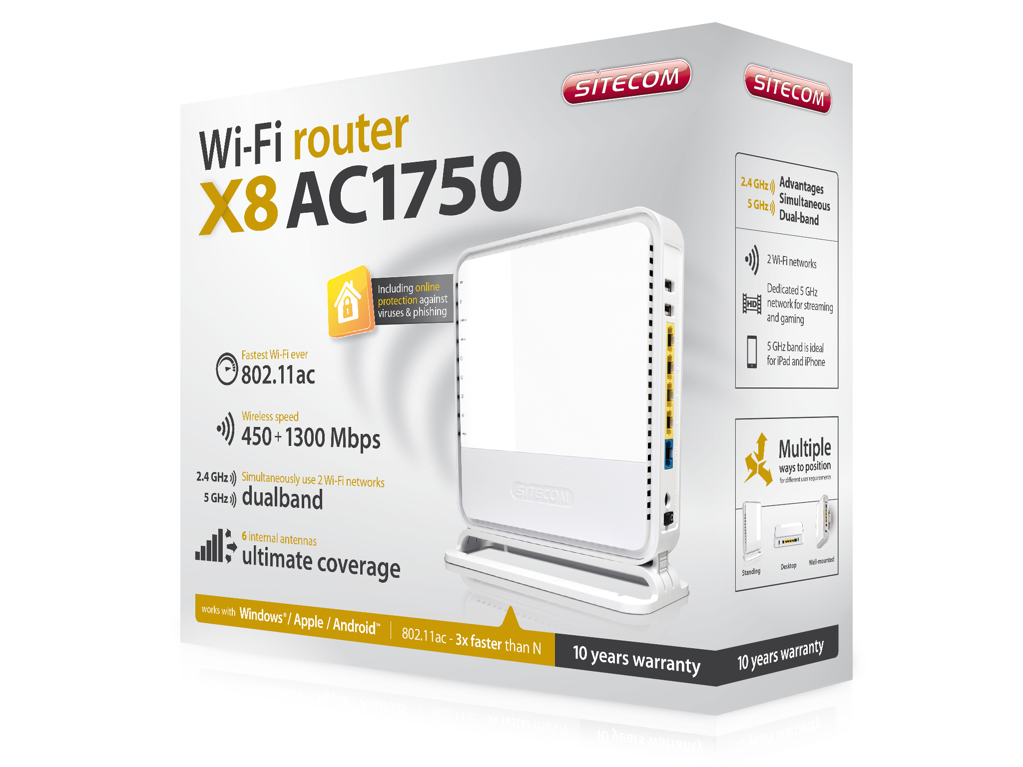 Entrambi i router ac sono provvisti di Sitecom Cloud Security, una funzione di sicurezza unica nel suo genere studiata per proteggere tutti i dispositivi domestici dalle minacce durante la navigazione in rete. Offre la protezione in tempo reale, senza bisogno di eseguire aggiornamenti. Il cloud viene costantemente integrato con le più recenti informazioni sui malware provenienti da quattro famosi fornitori di prodotti antivirus: Bitdefender, Emisoft, IKARUS e SurfRight. Sitecom Cloud Security integra in sé sei servizi, offrendo protezione da malware, phishing, exploit, siti Web dannosi, pubblicità potenzialmente pericolosa e monitoraggio dei comportamenti.