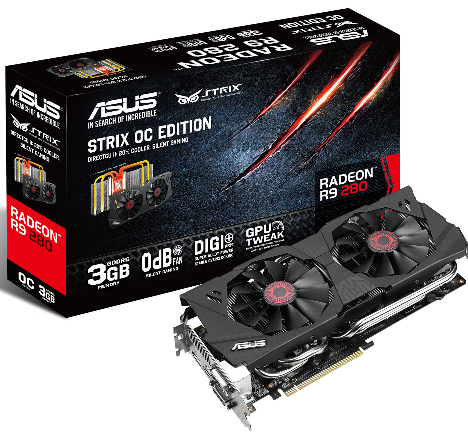 Il dissipatore grantisce un rumore pari a 0 dBA quando la GPU funziona a temperature inferiori a 65 ° C, e comincia a salire soltanto oltre tale soglia. Così gestire un uso desktop o carichi 3D dovrebbe essere estremamente facile e garantire una soluzione performante ma allo stesso tempo silenziosa. La scheda offre anche un OC di fabbrica. La GPU ha un clock di 980 MHz e la memoria di 5,20 GHz, rispetto al clock di una scheda reference con Core di 823 MHz e memorie di 5,00 GHz. Basata sul processo produttivo a 28 nm denominato "Tahiti", la Radeon R9 280 offre 1.792 stream processorss, 112 TMU, 32 ROPs e un'interfaccia di memoria GDDR5 con un bus di 384-bit. Le API supportate includono DirectX 11.2, OpenGL 4.4 e AMD Mantle. ASUS non ha rivelato i prezzi.