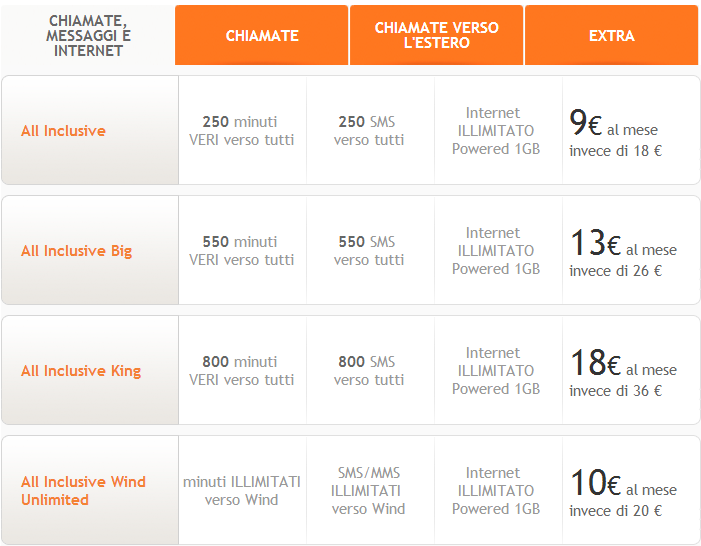 L’offerta di Wind è come sempre molto ampia ed offre diverse opzioni in base a quanto si vuole spendere. Ecco una tabella riassuntiva con i costi delle 4 proposte.