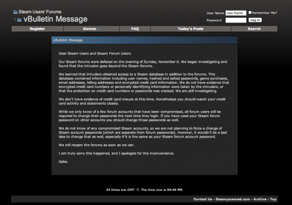 Parte del famoso database Steam di Valve sembrerebbe essere stata attaccata dagli hacker che potrebbero essere entrati in possesso di informazioni riservate di milioni di utenti compresi i numeri delle carte di credito.A confermarlo lo stesso Gabe Newll che ha dichiarato che il 6 novembre parte del database è stata accessibile anche a persone non autorizzate, tale parte contiene nomi, password, giochi, indirizzi e codici di carte di credito di moltissimi utenti. Lo stesso direttore della Valve ha poi aggiunto che è ancora in corso un'indagine a riguardo e che non si ha la certezza dell'accaduto, rassicura comunque gli utenti consigliando di controllare periodicamente le transizioni avvenute con la carta di credito utilizzata al fine di bloccare quelle non autorizzate e che saranno tutelati a riguardo.