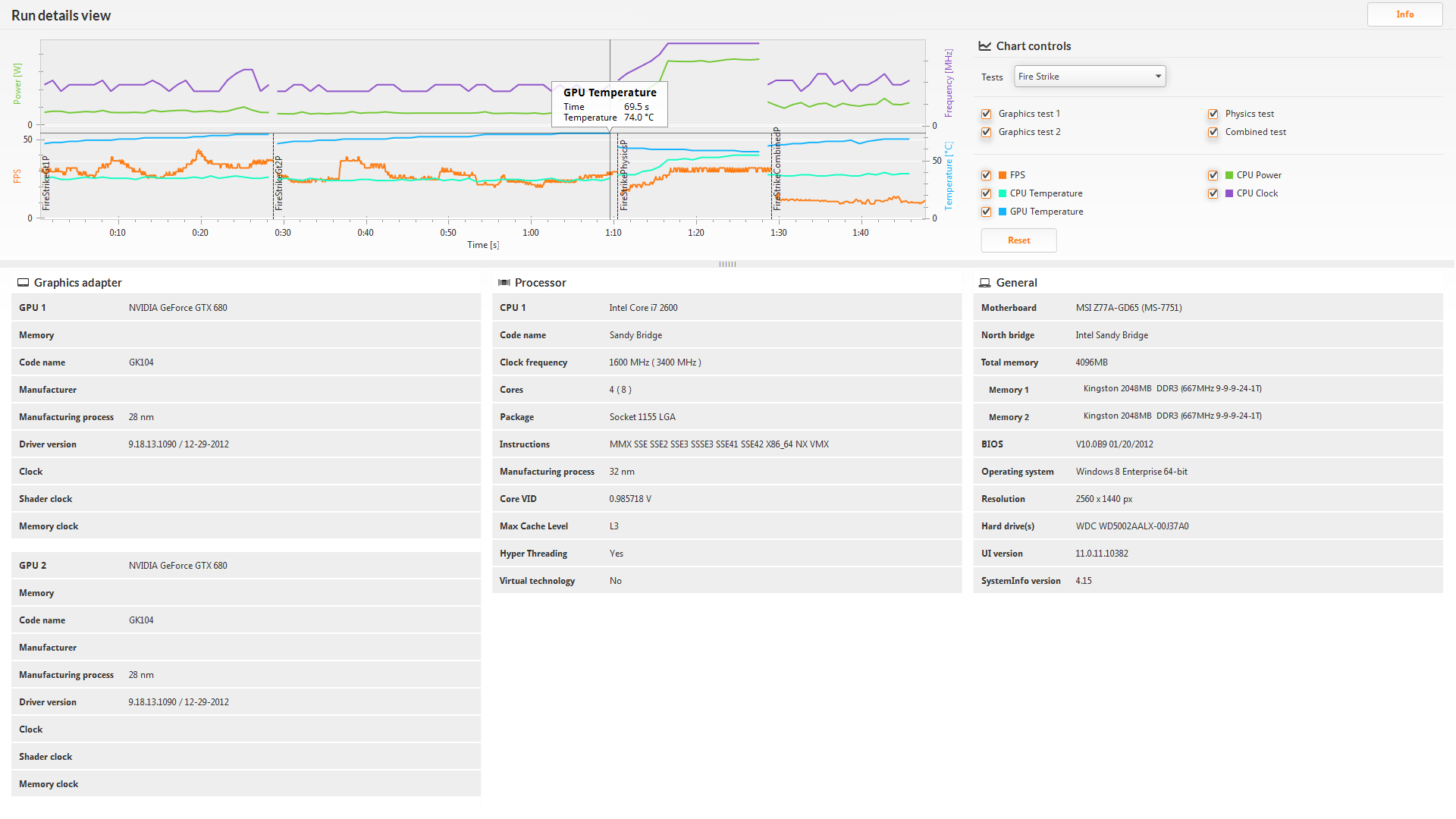 Il responso del nuovo 3DMark sarà inoltre più completo, grazie alla presenza di grafici prestazionali interattivi. Dallo screen si nota come venga graficato l'andamento degli FPS, della temperatura della GPU / CPU e delle frequenze di esercizio.