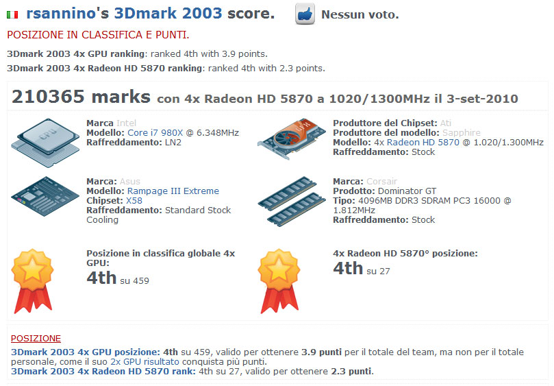 Altro strabiliante risultato ottenuto dal nostro Team di OC. Rsannino agguanta un ottimo risultato sul 3DMark 03, ben 210235 marks ottenuti con una configurazione 4 cross fire di ATI 5870 @1020/1300 Mhz.