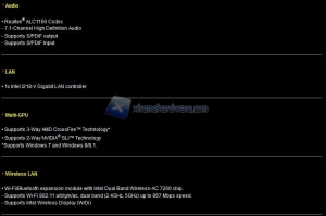 Tra le specifiche rilevanti di questa scheda madre, occorre menzionare il support al 3-way CrossFire grazie ai tre slot PCI Express, anche se consigliamo per schede video top di gamma come le AMD R9 290X di optare per schede madri dotate di switch PLX o comunque in grado di garantire una bandwidth su ogni scheda di almeno 8x. Dato infatti che la scheda supporta tre schede video solo in configurazione x8/x4/x4, il 3-way SLI non può essere supportato, come da specifiche NVIDIA. La connettività come già visto è completa, abbondante è il numero di porte per i dispositivi di storage, e la mancanza del SATA Express può essere colmata con l’adattatore opzionale per lo slot M.2.
