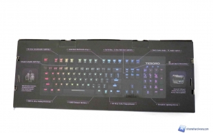 Per la Excalibur Spectrum, Tesoro adotta la classica confezione in cartone sulla quale troviamo la grafica tipica dei prodotti Tesoro. Con la Spectrum, troviamo un'immagine illustrativa del prodotto con le solite caratteristiche sintetizzate in loghi e brevi accenni ad essi nonché il logo "Spectrum" che ci proietta subito la tipologia e la principale caratteristica della tastiera, la retroilluminazione a spettro. E' presente infatti una retroilluminazione a più colori (in teoria 16mln) personalizzabile per i singoli tasti.