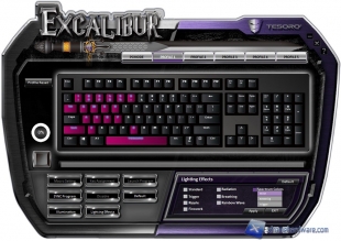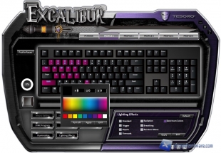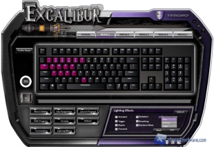 Notiamo la sua interfaccia identica ai modelli precedenti dunque colorata ma non per questo caotica. Sono presenti infatti tutte le informazioni necessarie alla personalizzazione delle funzioni. Il pannello di gestione della tastiera è dotato di tutte le voci per creare Macro o personalizzare la retroilluminazione. La grafica è identica al software di altre tastiere e cambia solo il "nome/logo" presente in alto, in questo caso Excalibur come la spada nella roccia della leggenda del re Artù. Abbiamo già notato in altre occasioni come il nome dei prodotti del brand americano siano ispirati ai miti greci, antichi e mitologici.