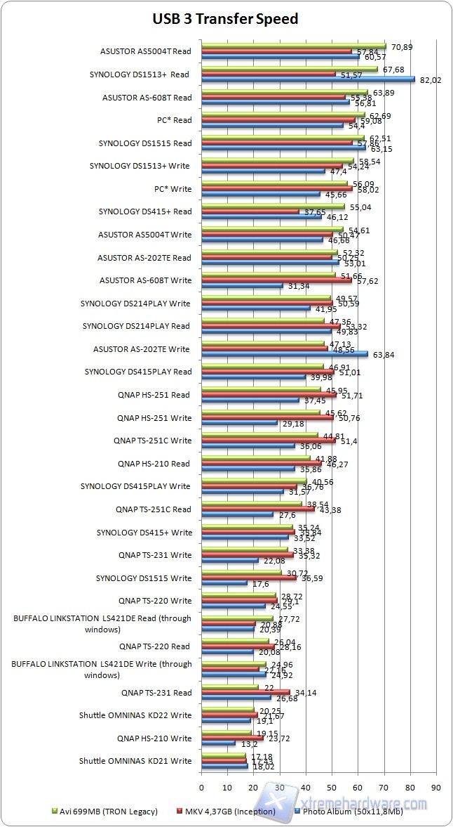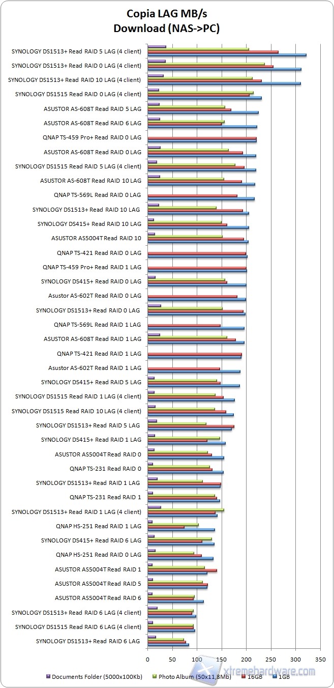 In fase di lettura dei dati dal NAS ai PC il nostro DS1515 si posiziona al terzo posto in configurazione RAID 0. In generale possiamo dire che la banda non si quadruplica effettivamente ed anche i risultati rispetto al fratello DS1513+ sono più modesti. I valori sono buoni, superiamo infatti i 200MB/s in un paio di occasioni, ma son comunque distanti da quello che ci aspettavamo. In fase di scrittura invece le cose cambiano facendo registrare valori prima mai visti. Raggiungiamo e superiamo i 250MB/s e ben due configurazioni occupano i primi quattro posti (primo e terzo). In questo caso un elogio al DS1515.