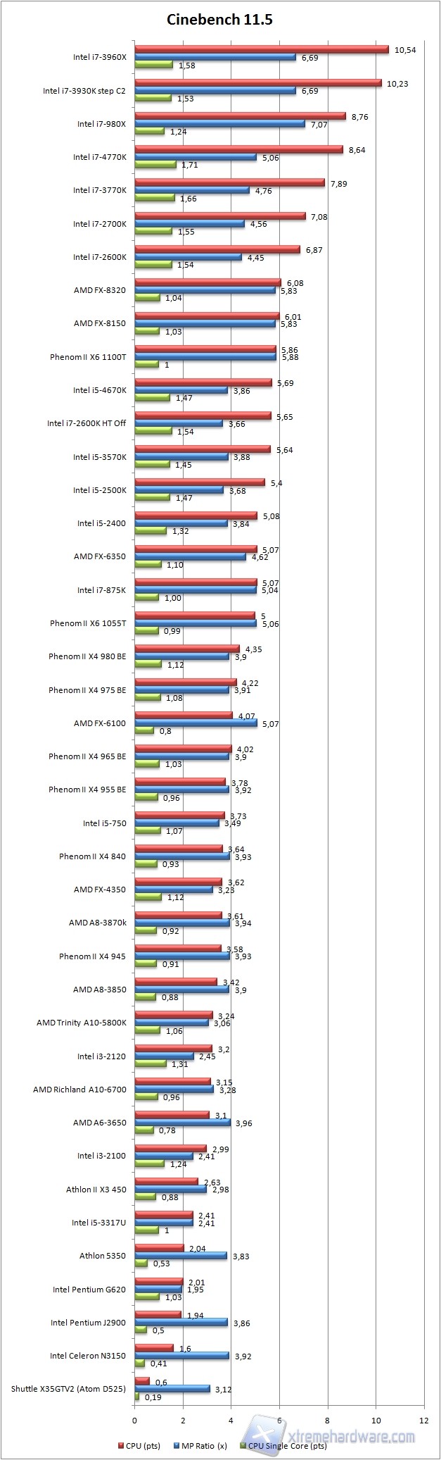 Cinebench mostra che il divario tra l'Intel J2900, l'N3150 e l'AMD 5350 non è molto marcato.