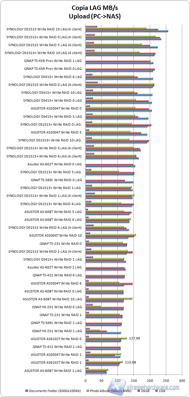 Anche in fase di scrittura su NAS il Link Aggregation ci ha lasciato l'amaro in bocca facendo registrare valori massimi pari a 127,99MB/s.