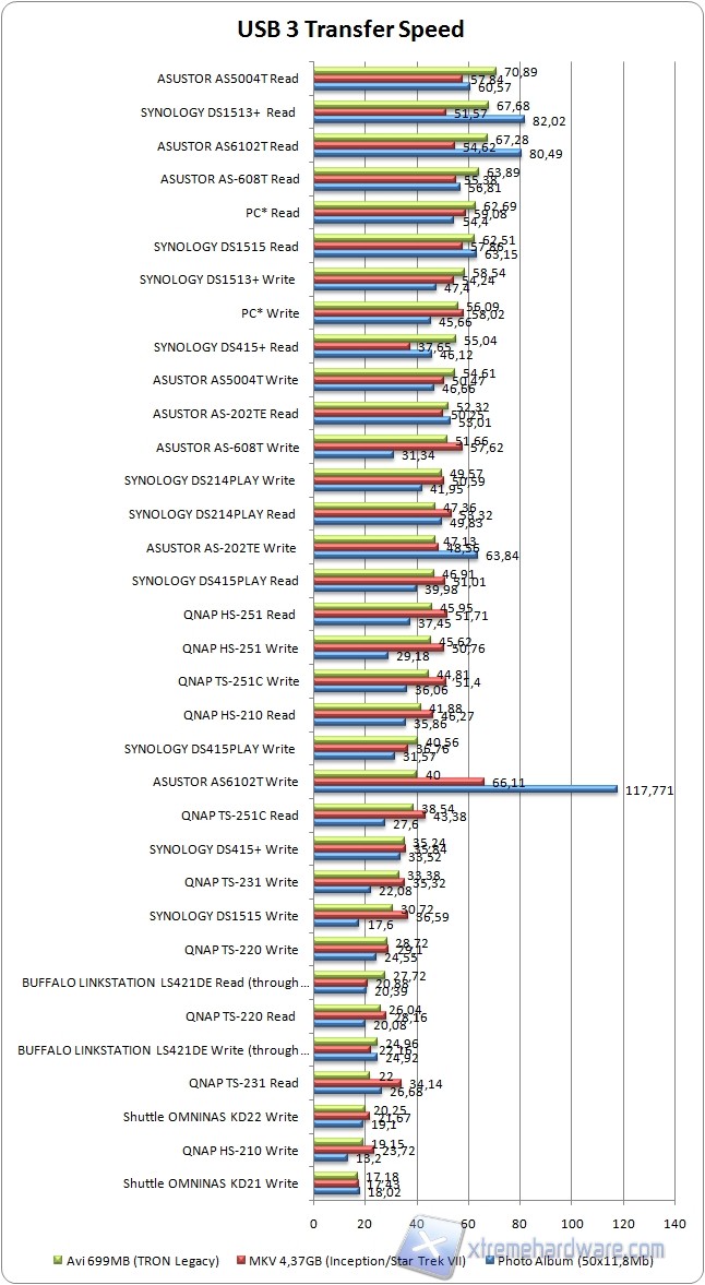 La porta USB 3.0 risulta molto molto veloce. Siamo rimasti stupefatti nel leggere il valore di 117 MB/s in fase di scrittura del "Photo Album" ma provando e riprovando il test il risultato non è cambiato. Anche la copia del film in MKV è risultata molto veloce facendo registrare ben 66,11MB/s.