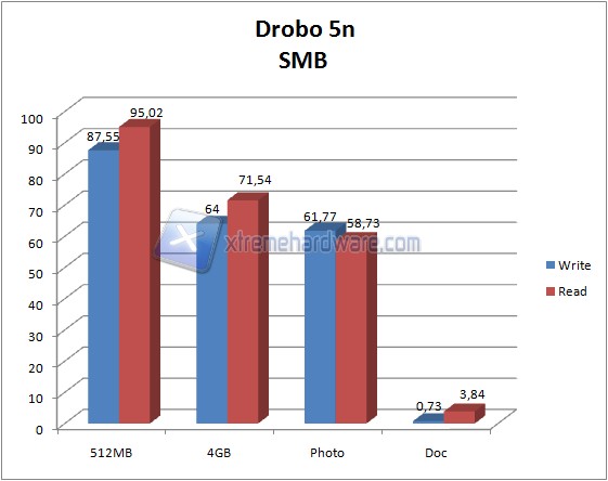 Utilizzando il protocollo SMB (il classico “copia e incolla”) le performance si ridimensionano leggermente verso il basso raggiungendo un picco di 95.02MB/s in fase di lettura e 87.55MB/s in fase di scrittura.
