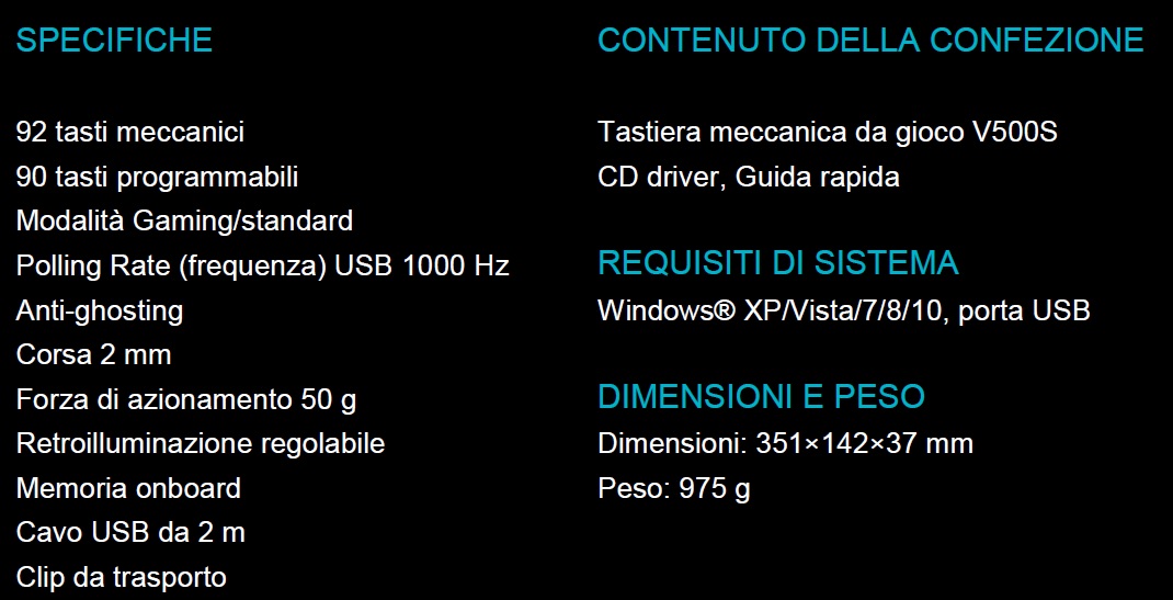 Procediamo ad elencare brevemente le caratteristiche della tastiera Rapoo VPRO V500s: