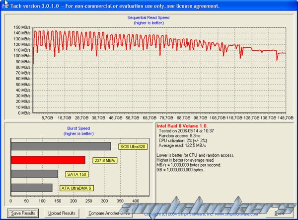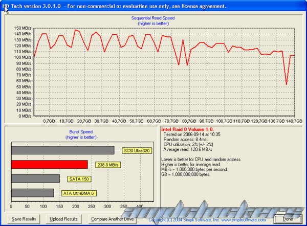 Abbiamo configurato in maniera davvero semplice un RAID0 con 64k di stripe composto da due raptor da 74 gigabyte ciascuno e lo abbiamo testato con il programma HDtach ottenendo i seguenti risultati: