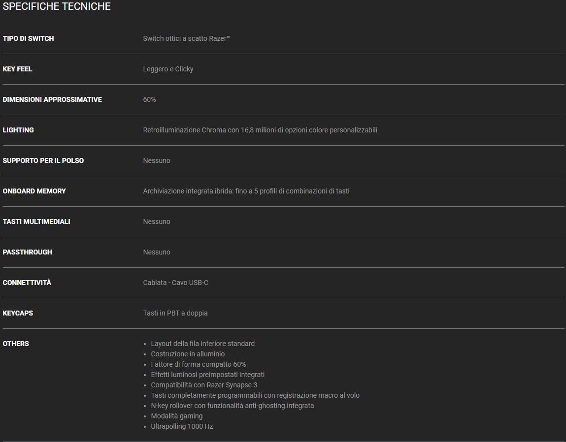 A seguire riportiamo la consueta tabella che ci illustra le principali specifiche relative questa tastiera meccanica in formato compatto di Razer.