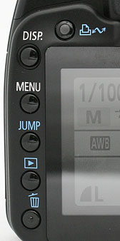 L’ampio schermo della EOS 400d è contornato sulla parte sinistra da cinque piccoli pulsanti, comprendenti anche l’ormai onnipresente tastino print-share che fu introdotto inizialmente solo nelle macchine digitali compatte della Canon, mentre la prima Reflex SLR che ne fu dotata era la Canon EOS 5D da oltre 2000 euro. Questo pulsante si illumina di blu se connesso ad una stampante compatibile o ad un PC via USB e sta a significare che si può iniziare a trasferire o stampare le immagini immediatamente. Il trasferimento delle immagini è molto veloce grazie alla porta USB 2.0. Ma la cosa che più colpisce in quella zona è situata nella parte alta dello schermo LCD, ossia un piccolo trasmettitore / sensore di raggi infrarossi che determina la presenza del nostro occhio (o di un qualsiasi altro oggetto nelle strette vicinanze). Questo sensore dice alla fotocamera che lo schermo LCD non ha più bisogno di essere acceso, ma non succede come nella Sony A100 dove automaticamente invia anche il segnale all’autofocus. Canon ha infatti deciso di lasciare questo compito al pulsante di scatto. Questo secondo noi è un ottima decisione poiché può capitare di non spegnere immediatamente la fotocamera tra uno scatto e l’altro, e non ci troveremo quindi ad avere l’autofocus in azione ogni qual volta che un oggetto si avvicina al sensore (un gran vantaggio per quanto riguarda la durata della batteria).