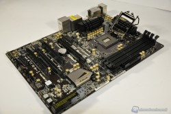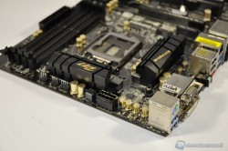 Notate come il contrasto grigio scuro del PCB ed oro dei condensatori dona alla scheda un binomio accattivante ed allo stesso tempo elegante. Anche i tasti di accensione e reset, nonché il display a 2 cifre, rendono più gradevole “e comodo” l’uso della motherboard “a banco” da parte degli overclockers.