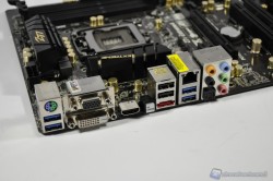 Il pannello posteriore comprendente le porte I/O totalizza 6 connettori USB di cui 4 porte (blu) in standard USB 3.0. Sono presenti 3 connettori per l’uscita del segnale video proveniente dalla GPU integrata, qualora il processore ne sia provvisto, di cui 2 digitali DVI/HDMI. Una porta PS2 mista per tastiera/mouse, una porta ethernet RJ45 insieme al blocco di uscite/entrate audio e per finire un comodo pulsante per le consuete operazioni di clear CMOS.