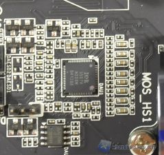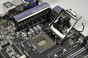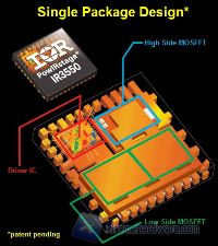 Come si può vedere dalla figura, i 3 Mosfet che costituiscono una fase (1 High side e 2 Low side), oltre al driver IC che ne sincronizza il funzionamento sono integrati in un unico chip: il PowIRstage IR3550. Questa soluzione, già adottata da MSI da diverso tempo, permette di miniaturizzare i componenti, aumentare notevolmente l’efficienza e e facilitare la dissipazione della fasi di alimentazione, senza rinunciare ad una notevole potenza erogabile, in grado di soddisfare l’overclocker estremo più esigente. L’IR3550 è infatti capace di erogare ben 60A DC. Sommando le potenze erogabili da ciascuna fase si ottiene già sulla UP4 una potenza totale erogabile sulla CPU praticamente impossibile da raggiungere, neanche con l’overclock estremo delle CPU Ivy Bridge.