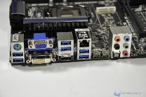 Nella foto l’insieme delle porte I/O della Z77X-UP4 TH. Partendo da sinistra abbiamo il blocco PS2 e 2 porte USB3.0. Quello successivo è relativo ai 2 connettori VGA/DVI per l’uscita del segnale video al monitor/TV. Proseguendo sempre verso destra abbiamo altre 2 porte USB3.0 ed una porta video digitale HDMI rev. 1.3a. In successione vediamo una porta LAN RJ45 in standard Gigabit più altre 2 porte USB3.0. Per finire ben 2 porte Intel Thunderbolt (MDP1/MDP2) ed il blocco che serve il flusso audio in entrata ed in uscita.