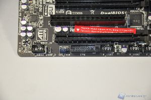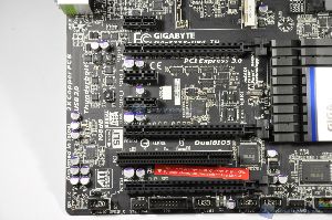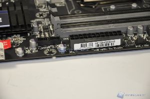 In foto, il blocco dei 7 slot di espansione. Partendo dall’alto il 1°, 3° ed il 4° sono slot PCI-Express 1x. Il 2°, il 5° ed il 7° sono slot PCI-Express 16x a lunghezza intera mentre il 6° slot è compatibile con il vecchio standard PCI. In sostanza la scheda supporta queste configurazioni: x16 / - / - oppure x8 / x8 / - oppure x8 / x4 / x4 logicamente in modalità PCI-Express 3.0 (quindi con una CPU Ivy Bridge). Ciò è confermato dall’analisi posteriore delle connessioni della scheda che vede il quinto e il settimo slot connessioni elettriche x8 e x4 (fate attenzione quindi a popolare gli slot nel giusto ordine al fine di sfruttare al meglio le potenzialità della scheda). All’altezza del sesto slot, sulla sinistra, abbiamo il controller audio Realtek ALC892 compatibile con le specifiche 7.1 channel HD Audio.