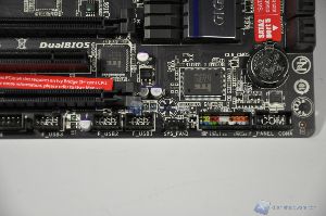 La parte sottostante è dedicata ai connettori I/O. Difatti da sinistra troviamo il connettore F_Audio per replicare sullo chassis i connettori (supporta il flusso HD Audio). Proseguendo abbiamo i connettori S/PDIF Out ed S/PDIF In, un attacco a 3pin SYS_FAN per la ventola e il connettore TPM (Trusted Platform Module Header). Poi 3 connettori F_USB per un totale di 6 porte USB2.0 ed un’altra porta SYS_FAN. Per finire F_PANEL che replica tasti/spie di accensione e funzionamento sul frontalino dello chassis e un attacco per porta COM. Nella parte superiore della linea perimetrale abbiamo la classica batteria a pastiglia per la conservazione dei dati nella CMOS e i due integrati ITE IT8728F per il controllo dei vari sensori ed IT8892E per il funzionamento dello slot PCI, standard non più supportato dai chipset Intel.