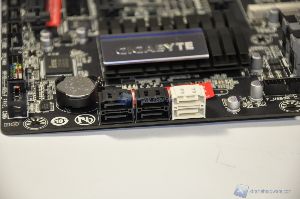 Il protagonista della foto è il grosso connettore a 24pin per l’alimentazione principale alla scheda madre, ma alla sua sinistra è presente un ulteriore connettore per replicare all’esterno sullo chassis 2 porte USB3.0, controllate dal chipset Intel. Alla estrema sinistra un altro attacco SYS_FAN.