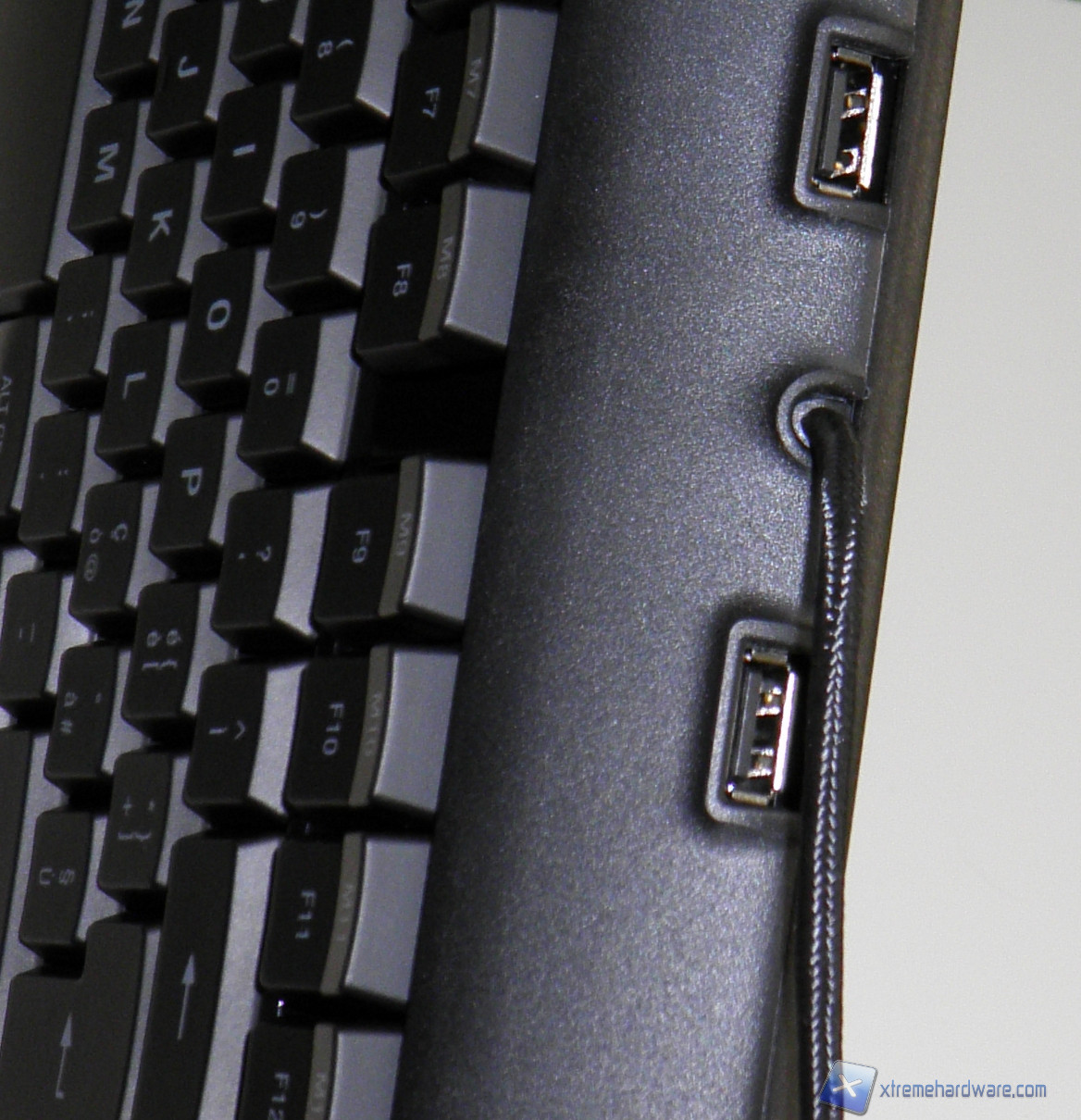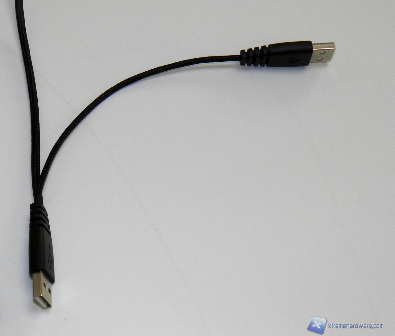 Il cavo in treccia di tessuto è terminato da due connettori USB. Osservando attentamente il cavo si può intuire che il secondo connettore è solamente ausiliario per quanto riguarda l'alimentazione della tastiera. Tale ipotesi è sostenuta dall'etichetta presente sul retro della tastiera: la Apex richiede, infatti, 1000 mA per il corretto funzionamento, mentre lo standard USB 2.0 prevede una corrente massima erogata di 500 mA. L’elevato numero di LED presenti porta probabilmente ad un consumo maggiore della tastiera.