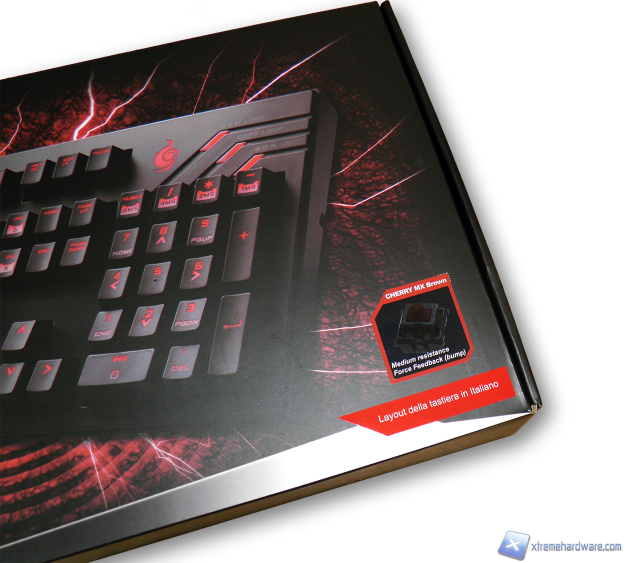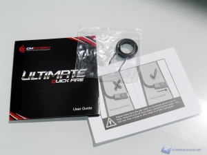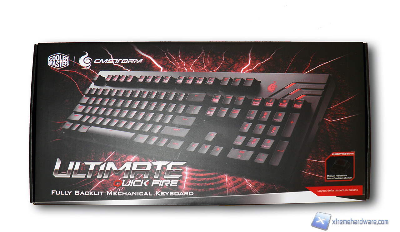 La confezione della QuickFire Ultimate è in classico stile CM Storm: con una forte predominanza del nero e di forti contrasti. Troviamo raffigurata la QuickFire Ultimate nella parte frontale accompagnata dal modello e dalla versione di Cherry MX installati.