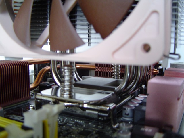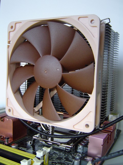 A questo punto possiamo montare la ventola che prima avrebbe ostacolato la presenza di un cacciavite. E' importante applicare i gommini alla ventola che impediscono di trasmettere le vibrazioni al dissipatore e creare quindi fastidiosi rumori. Usando 2 delle 4 clip a disposizione, possiamo fissare la NF-P12 in modo abbastanza semplice e veloce.