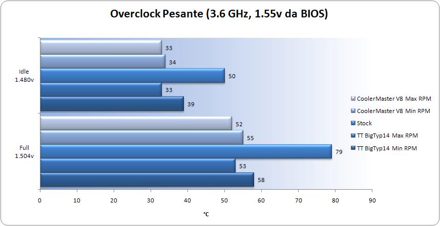 I risultati ottenuti confermano la bontà di questo dissipatore. Incredibile il testa a testa con il BigTyp14Pro che manifesta temperature del tutto identiche fino a 3,3Ghz andandosi a discostare di 1 solo grado a 3,6ghz. Ciò mostra che siamo al limite della capacità dei dissipatori ad aria. L'efficienza della struttura del CoolerMaster V8 si mostra abbassando il regime di rotazione della ventola in cui l'innalzamento di temperatura dovuto al minore flusso d'aria è più contenuto (3 gradi) rispetto al dissipatore della ThermalTake (5-6 gradi). Buona la rumorosità del CoolerMaster V8, molto silenzioso e quasi inudibile al minimo dei giri, mentre risulta inevitabilmente un po' più rumoroso al massimo dei giri. D'altra parte anche con la ventola al minimo le temperature rilevate sono ottime quindi non c'è pericolo di preoccuparsi della rumorosità.