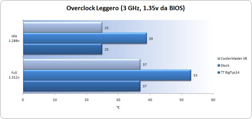 Metodologia di prova e test Abbiamo effettuato dei test, misurando le temperature raggiunte dal processore sia in idle che in full load, abbiamo poi comparato le temperature con quelle ottenute con il dissipatore stock della intel. Sono stati effettuati anche test di overclock aumentando il voltaggio della cpu. Abbiamo testato anche il ThermalTake BigTyp14Pro (già recensito) e il ThermalTake MaxOrb EX per ottenere una comparazione attendibile. I risultati del MaxOrb EX e la relativa comparativa verranno mostrati nella prossima recensione (Stay Tuned!). I software utilizzati sono CoreTemp per la rilevazione delle temperature e Prime95 per stressare la cpu. Ricordiamo che le temperature rilevate da CoreTemp sono quelle interne ai core e non quelle rilevate dalla scheda madre che spesso sono notevolmente più basse.