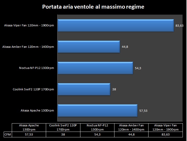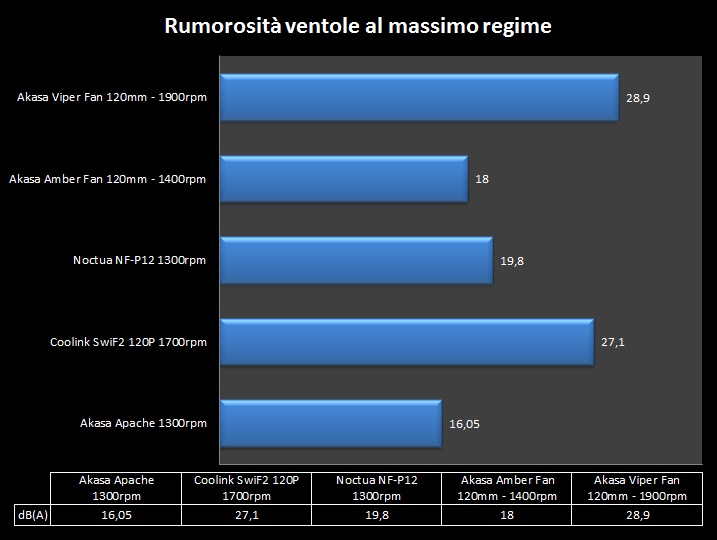 La ventola Apache, recensita qui, risulta essere un ottimo compromesso fra rumorosità e prestazioni, al massimo regime. La nuova Viper non è da meno, ma bisognerà abbassare leggermente la sua velocità se vogliamo diminuire il rumore.