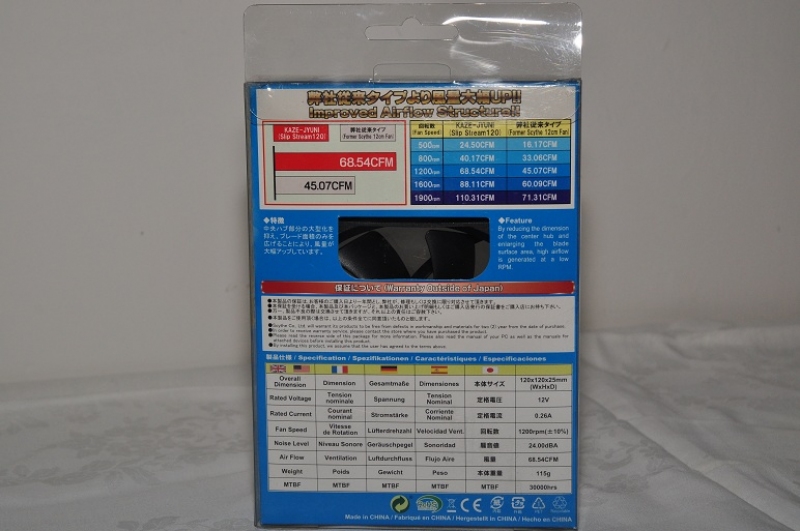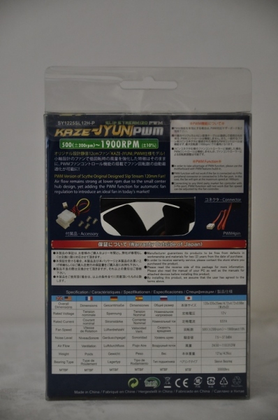 Le ventole sono riposte in una confezione di plastica molto semplice, attraverso la quale è possibile vedere il prodotto. Nel retro troviamo una tabella con le sue caratteristiche, il tutto scritto in lingua inglese e giapponese.